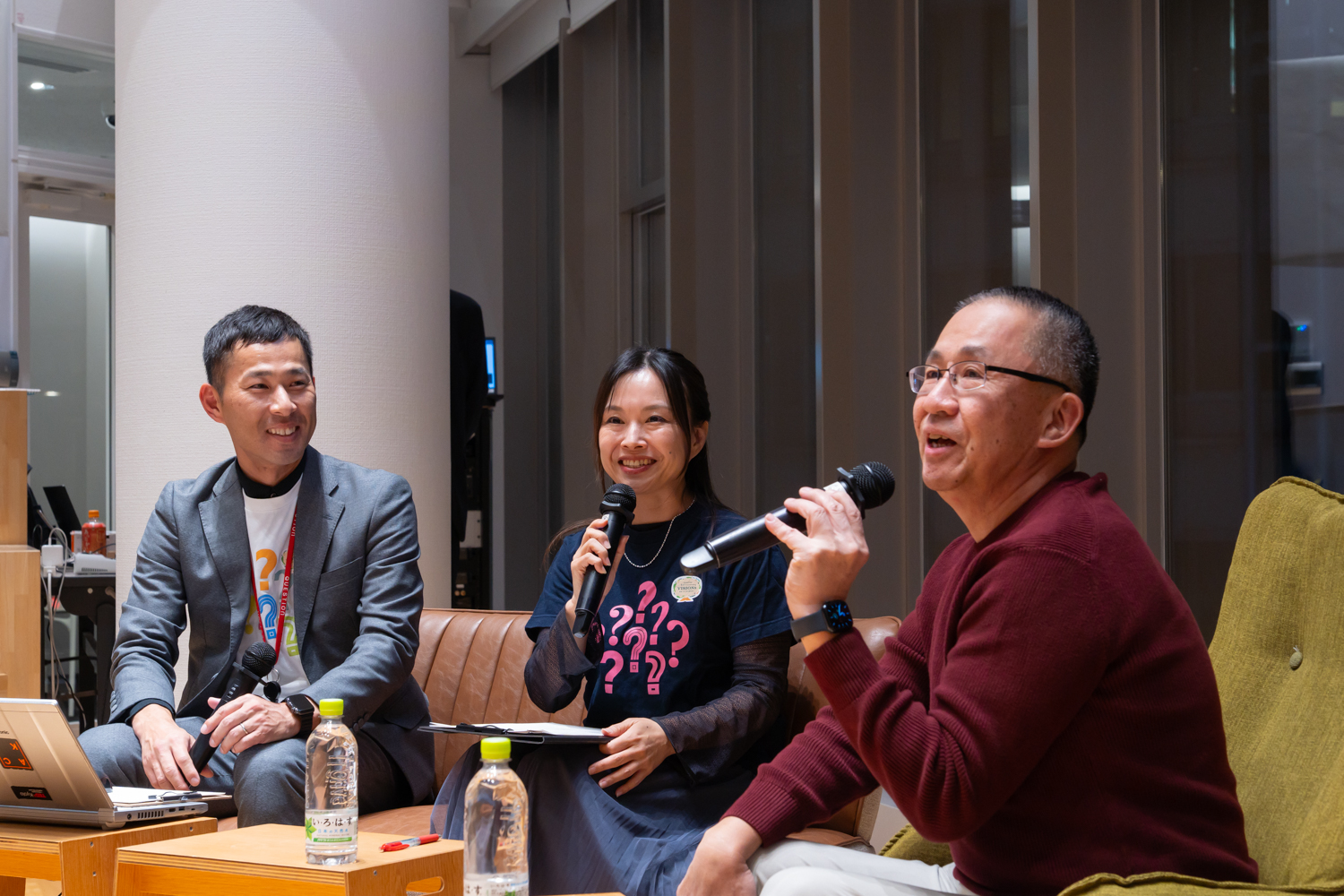 ゲストは、QUESTION初期からの会員である司法書士福村事務所の福村雄一さん(左)、合同会社WOWの橋本千恵さん(右)。QUESTION立ち上げ時に3名でイベントをしたことがあり、5年ぶりに同メンバーでの登壇となった