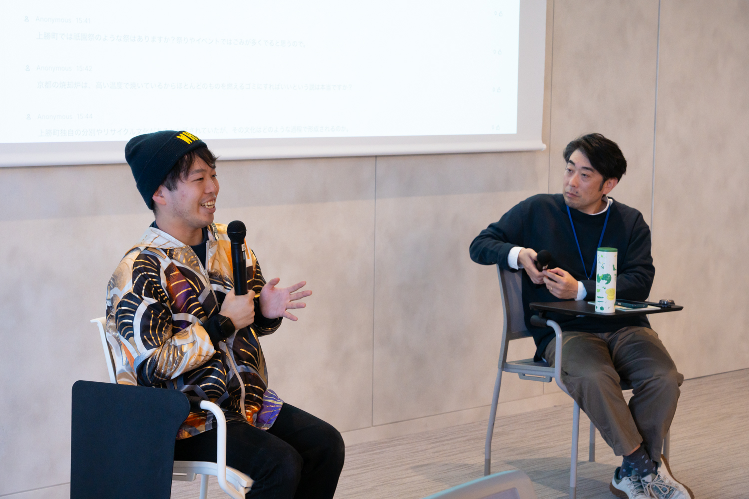 ゲストにゼロ・ウェイストの暮らしを続ける徳島県上勝町から木佐貫拓眞さん(左)、京都でサステナブルな取組を推進している河村翔さん(右)をお迎えした