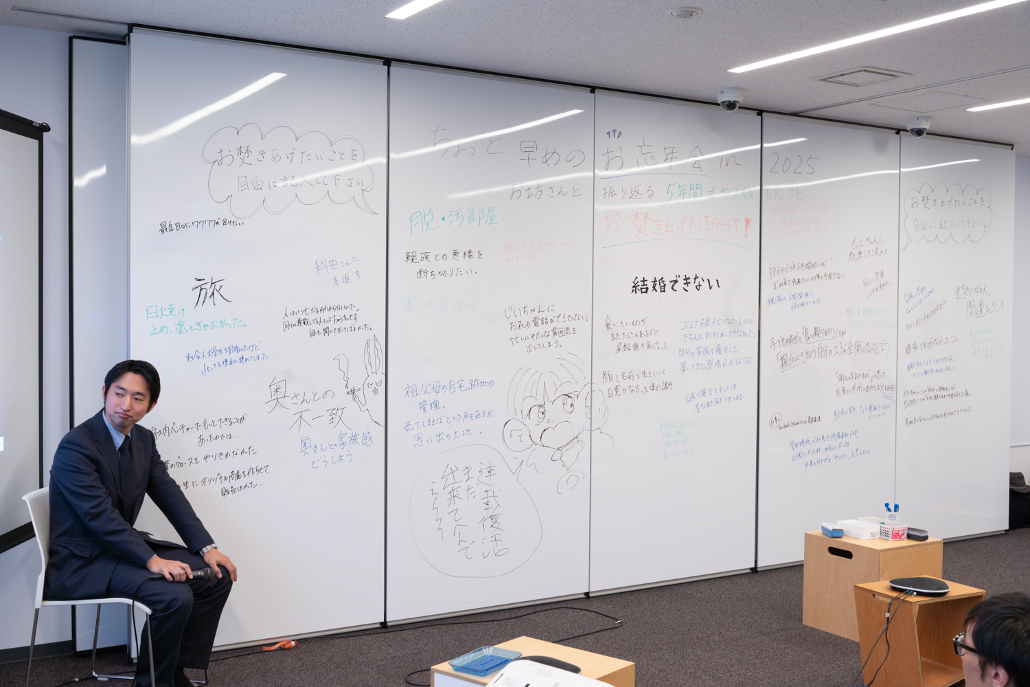 参加者にお焚き上げしたいことを自由にホワイトボードに書いてもらうと、「結婚できない」「もっとちゃんと勉強したらよかった」「職場の人間関係に悩み続けてしまった」「頑張り切れなかった」「転職に踏み切れなかった」など、参加者の様々なやり残したことが集まりました。
