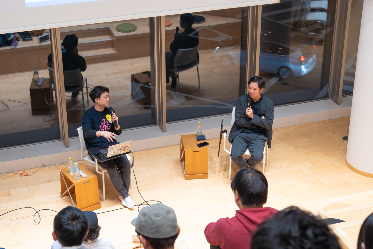 ゲストは京都を代表するインディーゲーム開発会社のroom6木村征史さん(左)、大阪でアナログゲームの制作支援をする大興印刷の成尾恒一郎さん(右)
