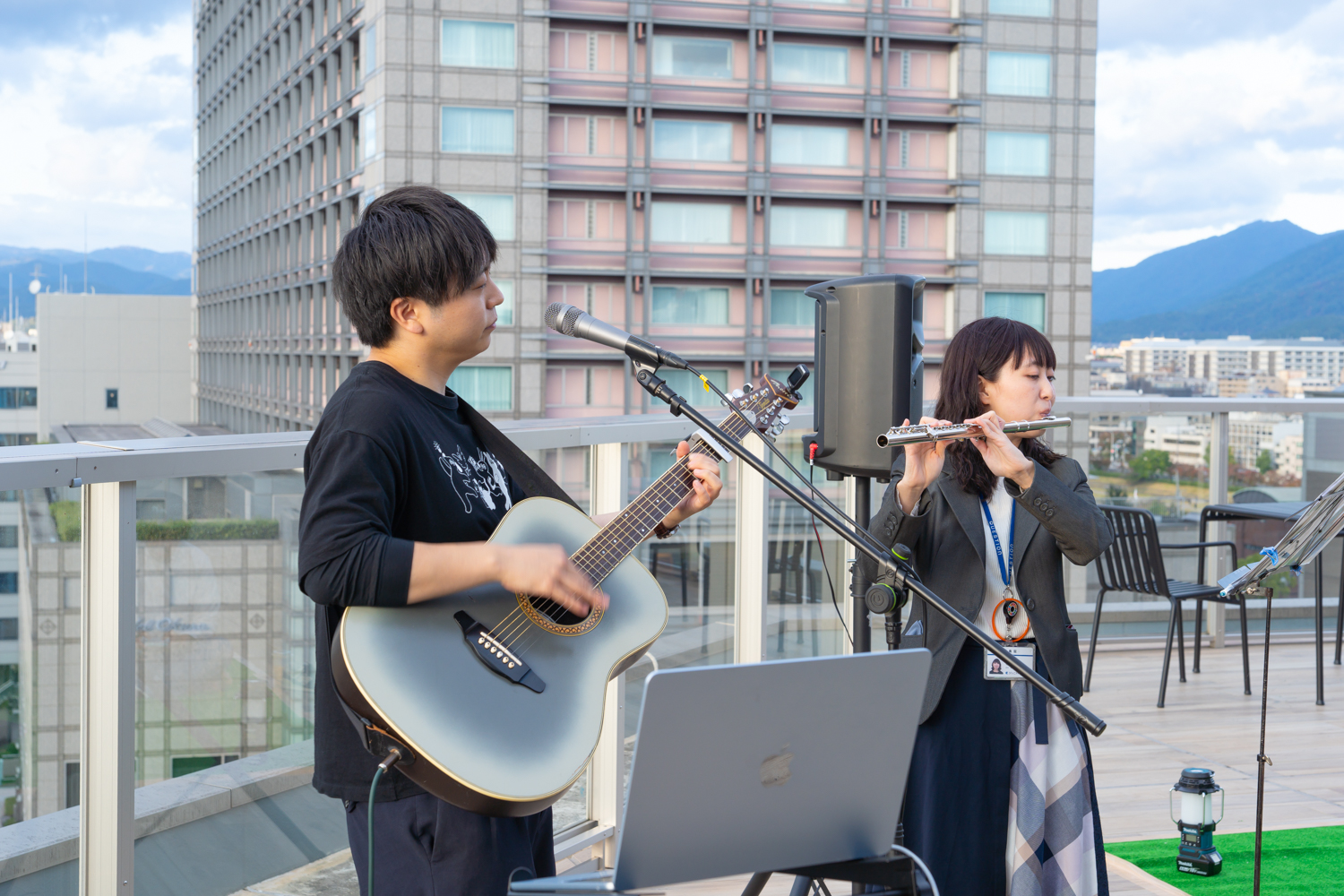 2日間に渡って、コミュニティマネージャーの新田廉が企画したのは、屋上を舞台にした音楽とトークの“青空休憩スポット”「Re:MIX」。弾き語りやDJなどで盛り上げ、クッションに持たれてくつろぎながらのんびり楽しむ空間になりました。
