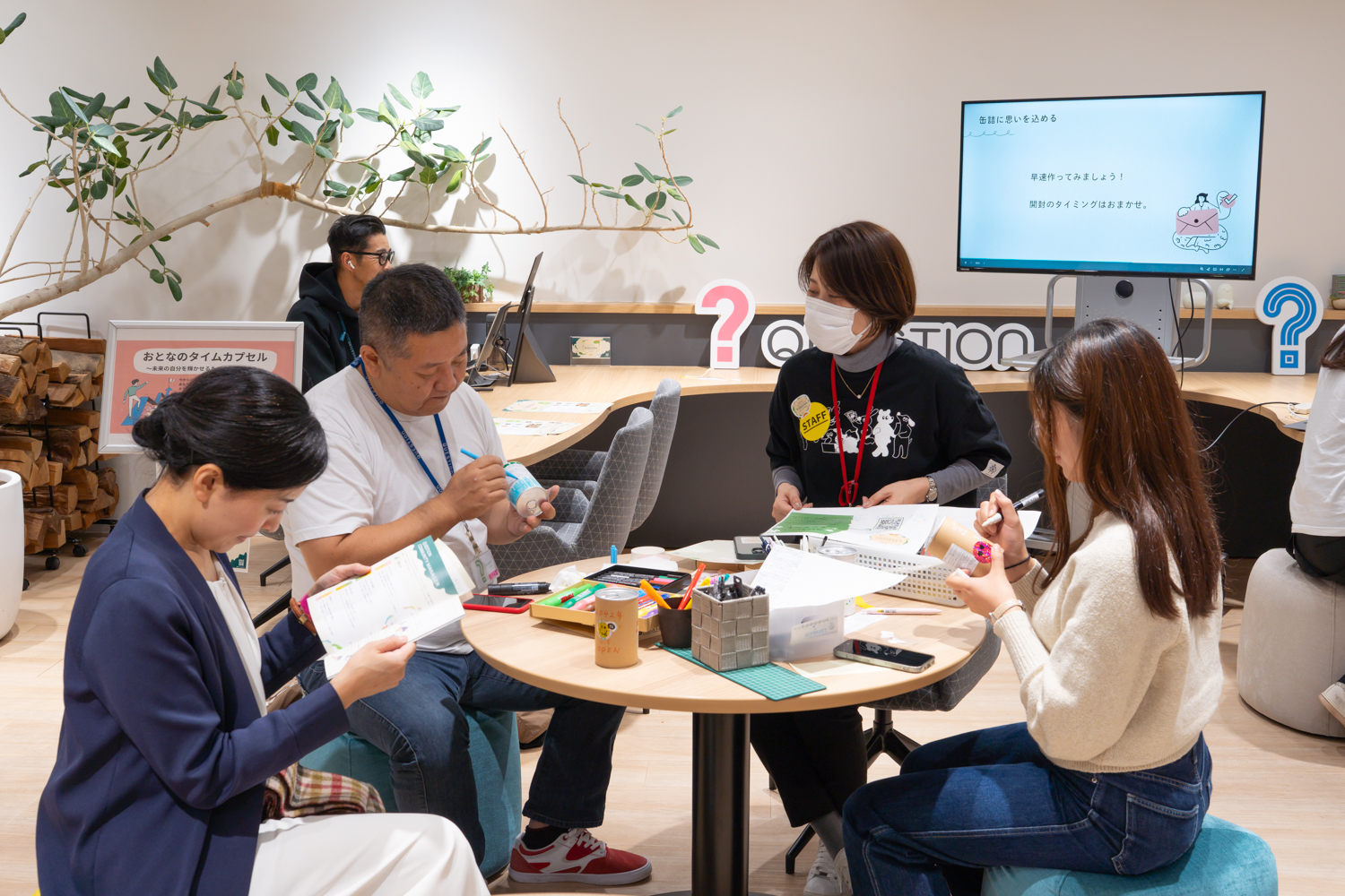 コミュニティマネージャーの嘉田良子が企画したのは未来を考える「おとなのタイムカプセル」。今の自分を振り返って、今後なりたい自分を想像し、実現するために「今やるべきこと」「今出会いたい人」を考えて、形にするプロセスを楽しんでいただきました。