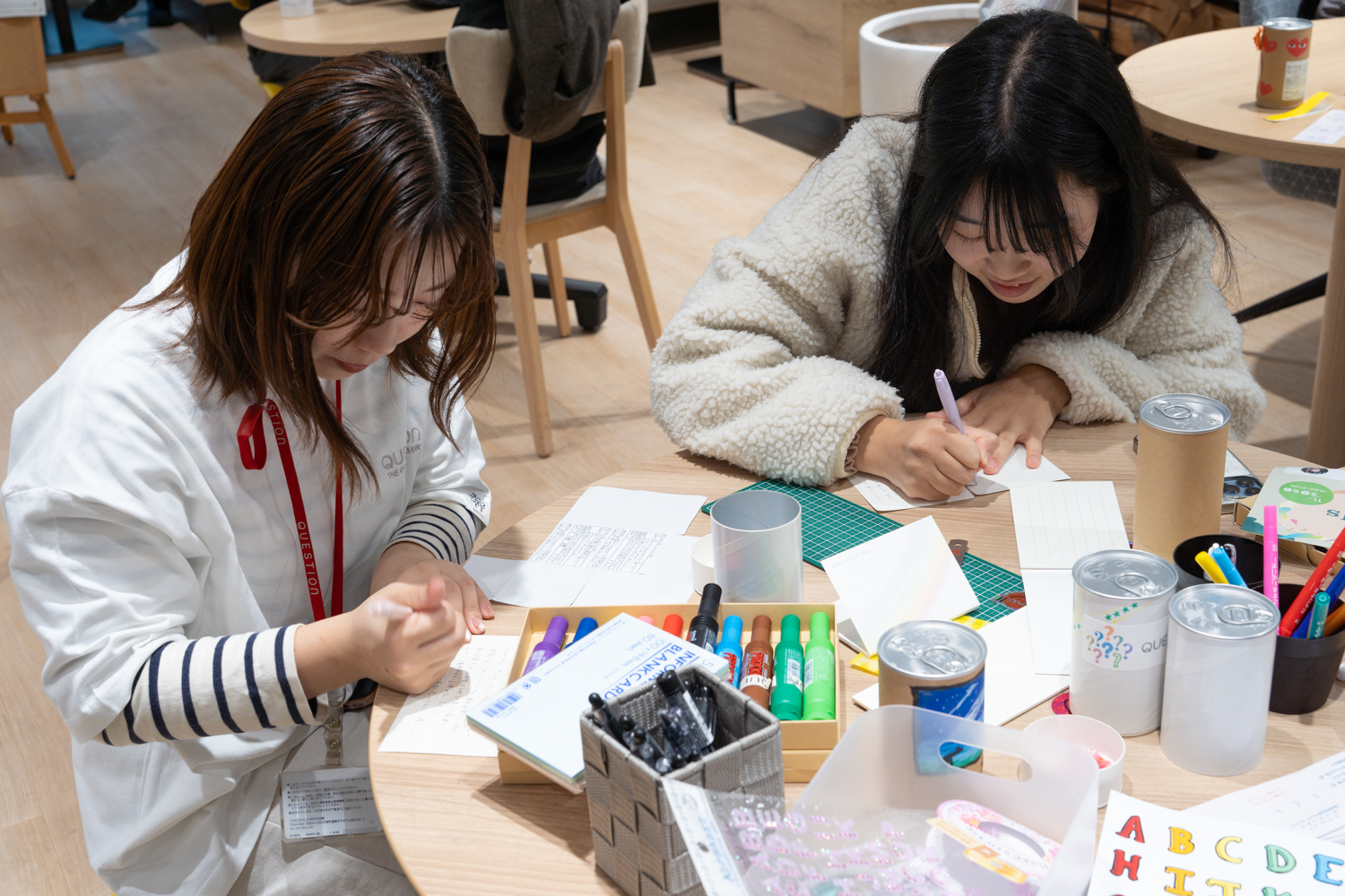 なりたい自分を想像して、何年後かへのメッセージを書いて、缶詰に入れます。缶詰の外側にラベルシールを貼ったり、色を塗ったりして自分だけのオリジナル缶詰が完成!2日間で約60名の方々がワークショップに取り組み、未来の自分にメッセージを届けました。