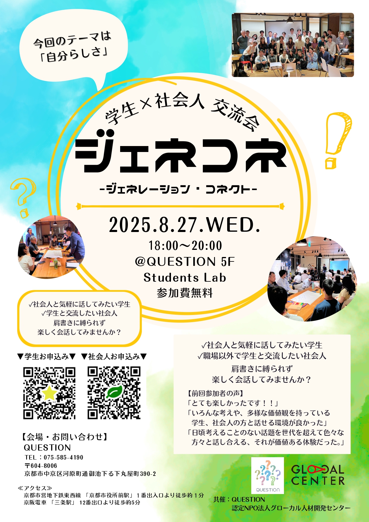 ジェネコネは、様々な年齢層の皆さんが集まり、学生と社会人が肩書きを外してフラットに対話することを通して現在を捉える・これからを考えるためのヒントを見つけられるイベントです。学生の皆さんも社会人の皆さんも一緒にワイワイ楽しく交流しましょう!