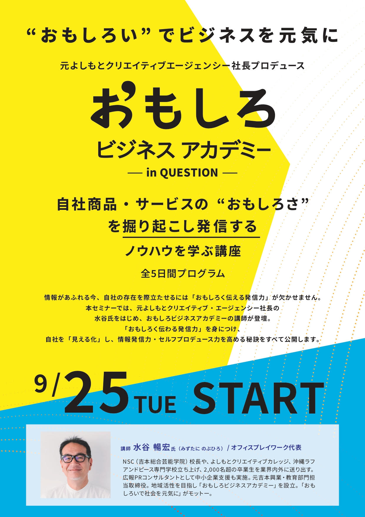 本講座では、元よしもとクリエイティブ・エージェンシー社長の水谷氏をはじめ、ユニークなコンテンツを作ってきた広報PRプロデューサー、落語作家、新聞記者、テレビディレクターなどクリエイターらが講師として登壇。