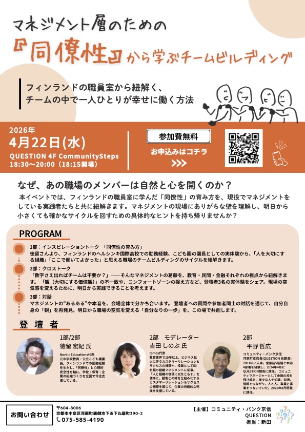 tomos代表の吉田しのぶ氏をモデレーターに迎え、徳留宏紀氏、コミュニティ・バンク 京信河原町支店 支店長で2026年3月までQUESTIONの館長だった平野の両名から、マネジメントの現場でありがちな経験談を交えたクロストークを展開。